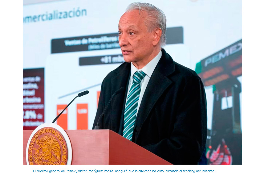 Asimismo, Rodríguez Padilla aclaró que se utiliza agua para fracturar la roca, pero no arena ni productos químicos. Precisó que en el gobierno de Enrique Peña Nieto (2012-2018) se hicieron pruebas en 25 pozos con fracking, pero desde 2018 se suspendieron.