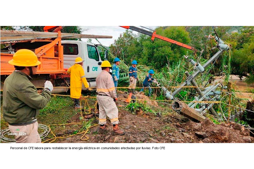En las zonas impactadas se cuenta con el personal y equipo necesario y la CFE trabaja de manera permanente hasta recuperar el 100 por ciento del servicio eléctrico.