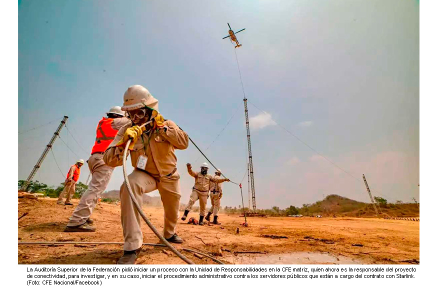 Ante las irregularidades registradas, la Auditoría Superior de la Federación pidió iniciar un proceso con la Unidad de Responsabilidades en la CFE matriz, quien ahora es la responsable del proyecto de conectividad, para investigar, y en su caso, iniciar el procedimiento administrativo contra los servidores públicos que están a cargo del contrato con Starlink.