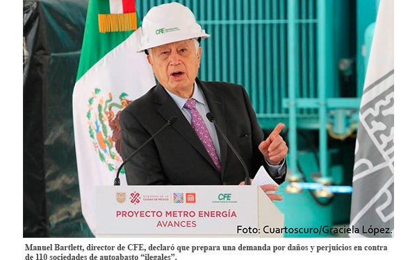 El 1 de julio de este año, durante la inauguración de la primera etapa de la nueva refinería Olmeca, el director de la Comisión Federal de Electricidad (CFE), Manuel Bartlett, declaró que se prepara una demanda por daños y perjuicios en contra de 110 sociedades de autoabasto “ilegales”, que le causan afectaciones por 10 mil millones de pesos por año.