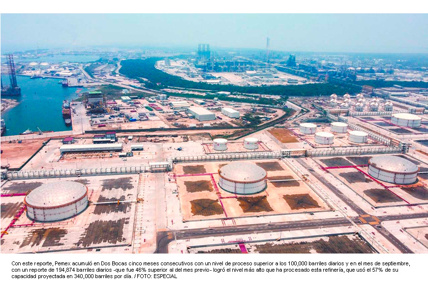 Con este reporte, Pemex acumuló en la refinería Olmeca ubicada cerca del puerto tabasqueño de Dos Bocas cinco meses consecutivos con un nivel de proceso superior a los 100,000 barriles diarios y en el mes de septiembre, con un reporte de 194,874 barriles diarios -que fue 46% superior al del mes previo- logró el nivel más alto que ha procesado esta refinería, que usó el 57% de su capacidad proyectada en 340,000 barriles por día.