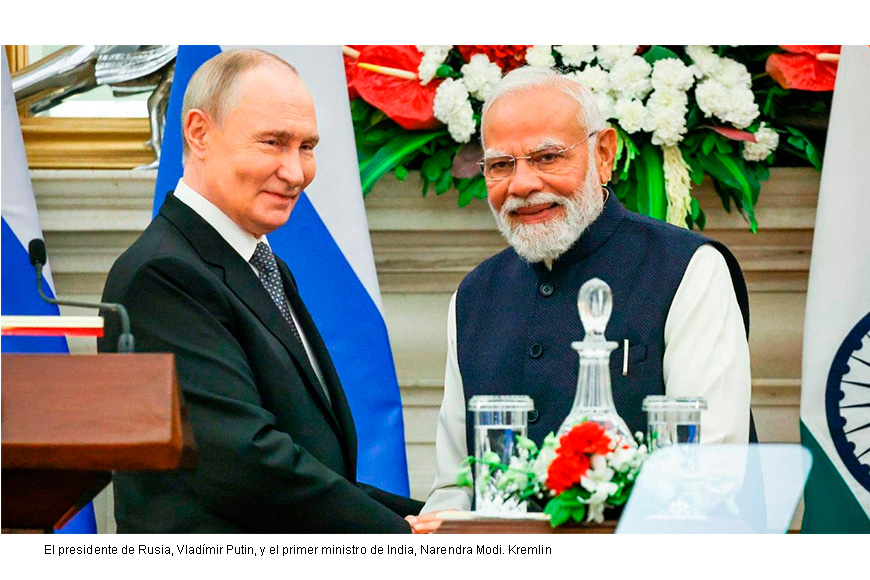 La semana pasada Putin viajó a Nueva Delhi, donde se reunió con el primer ministro indio, Narendra Modi, con quien firmó varios acuerdos en las áreas de comercio y transporte, entre otras, hasta 2030 para consolidar los lazos comerciales entre ambos países.