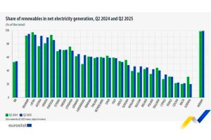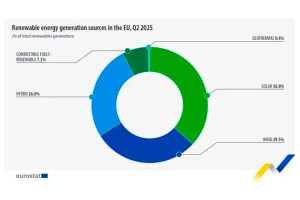 La revolución renovable sigue su curso. Según los datos de Eurostat, durante el segundo trimestre de 2025, más de la mitad de la electricidad neta producida en la UE —un 54 %— procedió de fuentes renovables. Esto supone un incremento respecto al 52,7 % registrado en el mismo periodo de 2024. Este avance se debió, principalmente, al fuerte crecimiento de la energía solar, que aportó 122.317 gigavatios hora (GWh), equivalentes al 19,9 % del total generado.
