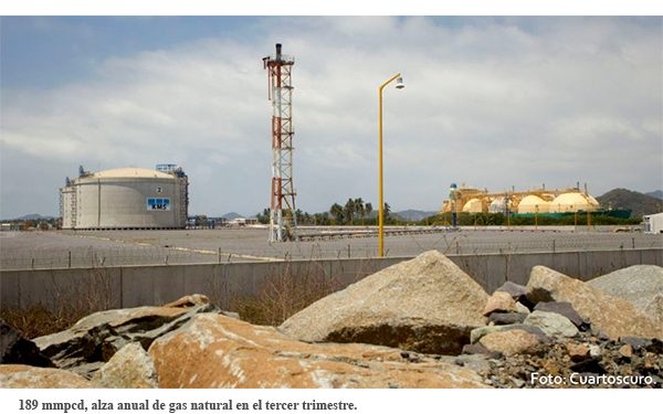 La producción de gas natural en México registró un crecimiento de 5.1 por ciento en el tercer trimestre del año, al totalizar tres mil 879 millones de pies cúbicos por día (MMpcd), frente al mismo lapso del año pasado, de tres mil 690 MMpcd, según datos de Petróleos Mexicanos (Pemex).