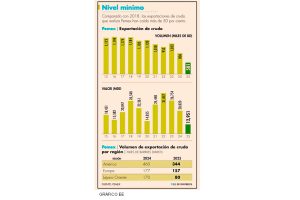 El valor de las exportaciones a América fue de 7,691 millones de dólares, con una baja anual de 35%; a Europa, el monto recibido por envío de crudo fue de 3,487 millones de dólares, con una baja de 24% anual, pero fueron los ingresos desde Asia los que mayor reducción tuvieron ya que se situaron en 1,771 millones de dólares, lo que significó una caída de 59% en comparación con el 2024.
