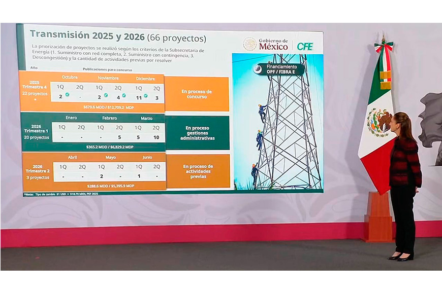 En el rubro de transmisión, la CFE ejecutará 66 proyectos prioritarios entre 2025 y 2026 para eliminar cuellos de botella, reforzar la red y acompañar el crecimiento industrial y urbano del país. De estos, 22 proyectos se concursarán en el último trimestre de 2025 y 44 más a lo largo de 2026, con calendarios definidos y seguimiento puntual.