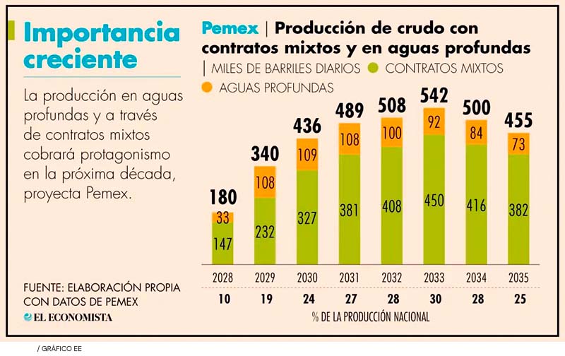 Los contratos mixtos y las aguas profundas aportarán el menos una quinta parte de la producción nacional la próxima década, según proyecciones de la estatal.