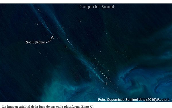 La emisión de metano en la plataforma Zaap-C, que apareció por primera vez el 8 de diciembre, fue descubierta por investigadores, entre ellos de la Universidad Politécnica de Valencia, y publicada por la Agencia Espacial Europea. Pemex confirmó la existencia de una emisión, pero rebatió el volumen calculado por los científicos.