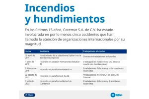 La empresa cierra el año con un conflicto laboral latente y una historia negra de accidentes con varios capítulos abiertos. Pese a explosiones espectaculares en varias plataformas de Pemex, ninguna autoridad laboral, del medio ambiente o de la función pública, la ha sancionado. Por el contrario, Cotemar S.A. de C.V. mantiene a flote tres contratos con la petrolera nacional, uno concluirá en 2028 y los otros en 2029.