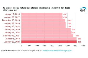 Las existencias operativas de gas natural en los 48 estados continentales de Estados Unidos cayeron en 360.000 millones de pies cúbicos (Bcf) durante la semana que concluyó el 30 de enero de 2026, en medio de la tormenta invernal Fern. Se trata del mayor retiro semanal neto jamás registrado en la historia del Informe Semanal de Almacenamiento de Gas Natural de la Administración de Información Energética de EEUU (EIA).