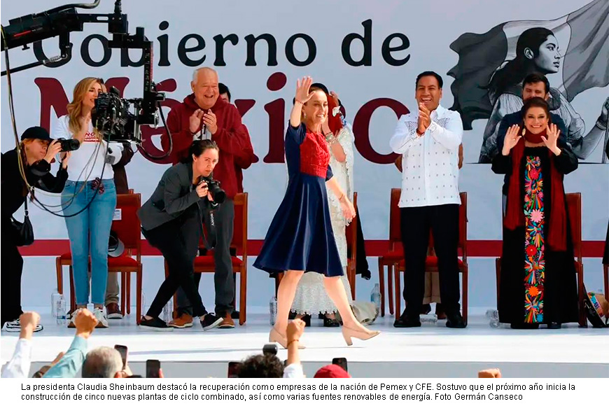 Destacó la recuperación como empresas de la nación de Pemex y CFE. Sostuvo que el próximo año inicia la construcción de cinco nuevas plantas de ciclo combinado, así como varias fuentes renovables de energía.